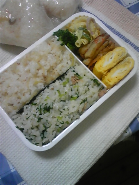 海苔で仕切って、大根葉のまぜご飯と二つの味のご飯